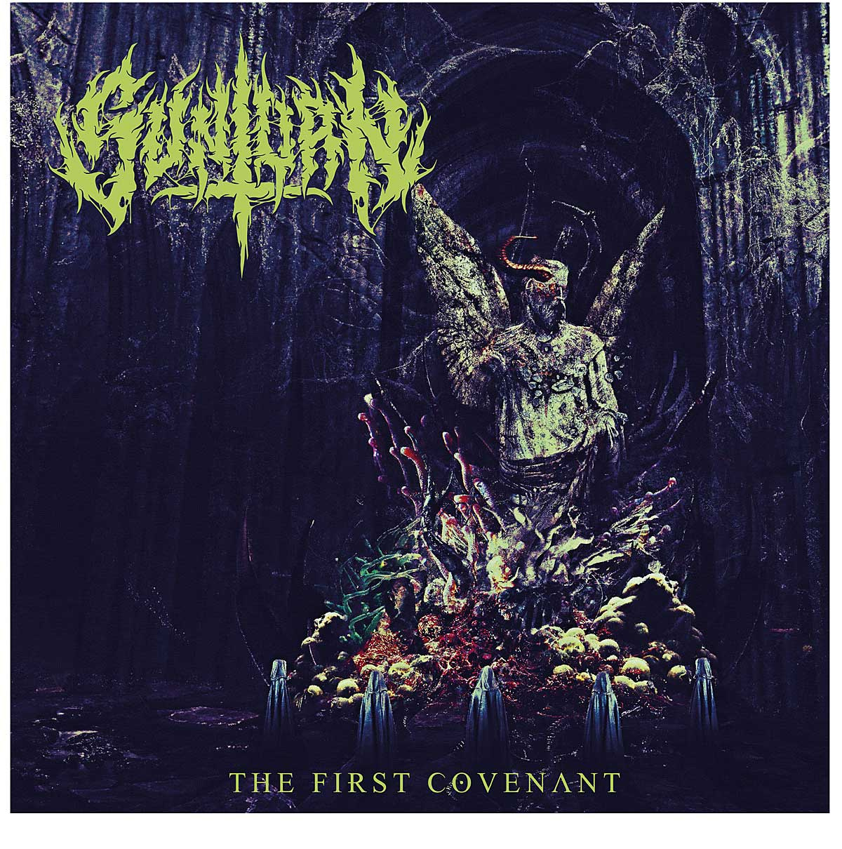 "Here’s where we’re at....Inside of an eerie looking church, in the center of it a religious statue cracking apart and underneath the statue a weird gross monster being, infront of the whole being/ monster five hooded figures around the monster representing each member (maybe just shadow out faces and have 3 of them with king hair sticking out of the hood. The religious statue represents all these good things and underneath is something awful, something gross and wierd inside the statue and we want to incorporate a sewer green color somewhere"