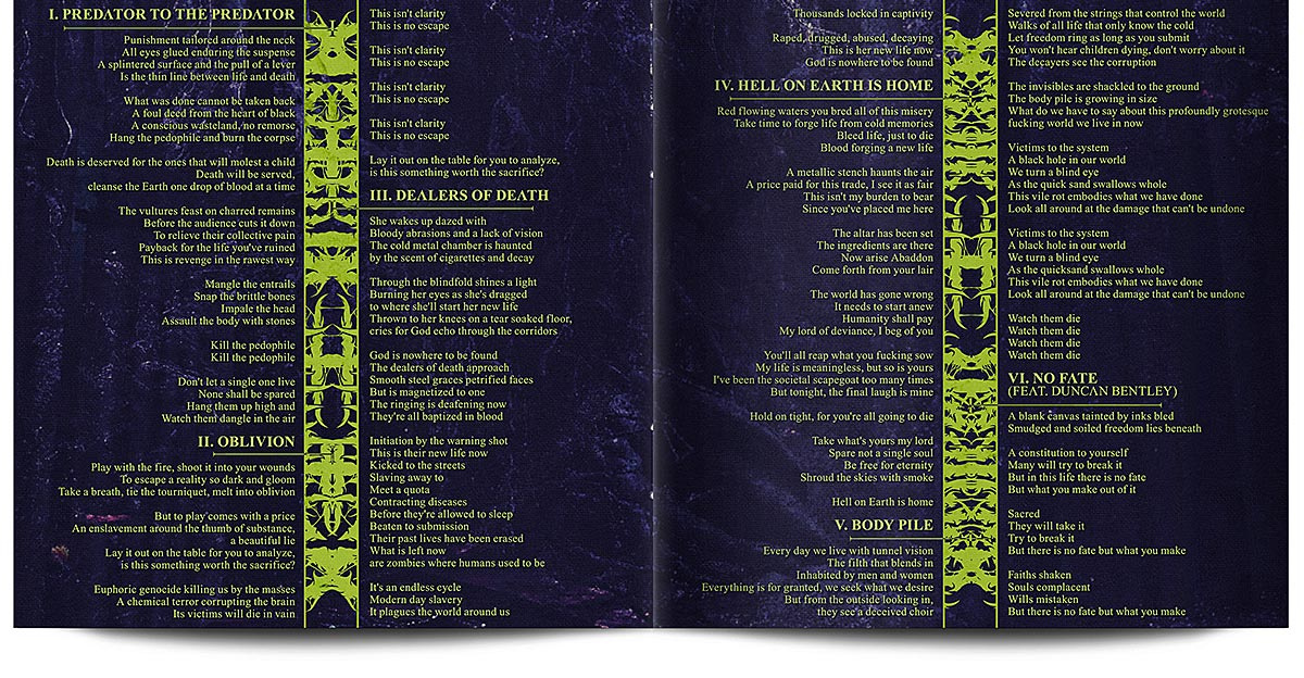 "Here’s where we’re at....Inside of an eerie looking church, in the center of it a religious statue cracking apart and underneath the statue a weird gross monster being, infront of the whole being/ monster five hooded figures around the monster representing each member (maybe just shadow out faces and have 3 of them with king hair sticking out of the hood. The religious statue represents all these good things and underneath is something awful, something gross and wierd inside the statue and we want to incorporate a sewer green color somewhere"